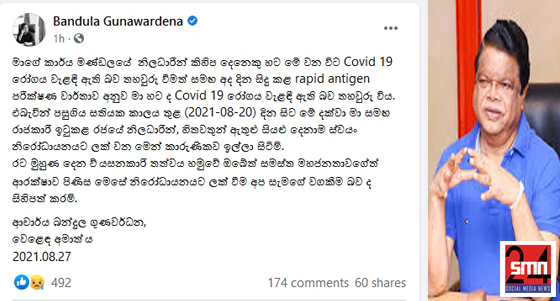 Post Views: 402 වෙළද අමාත්ය බන්දුල ගුණවර්ධන මහතාට කොවිඩ් -19 වෛරසය ආසාදනය වී ඇති බව තහවුරු වී තිබේ. සිය ෆෙස්බුක් පිටුවෙහි සටහනක් තබමින් ඇමතිවරයා තමා ආසාදිත බව පවසා තිබේ. ඒ අනුව මෙම මාසය තුළදී කොවිඩ් ආසාදිත බවට තහවුරු වූ 9 වැනි පාර්ලිමේන්තු මන්ත්රීවරයා ලෙසට ඔහු වාර්තා වෙයි. පසුගිය සිකුරාදා පැවති කොවිඩ් මර්ධන කාර්ය සාධක බලකා රැස්වීමටද ඒ මහතා සහභාගී වී තිබුනි. ෆෙස්බුක් සටහන පහතින් Post navigation එන්නත්කරණ මධ්යස්ථානයක උණුසුම් තත්ත්වයක් – 18ට අඩු ළමුන්ට හොර රහසේ එන්නත්. අපරාධ පරීක්ෂණ දෙපාර්තමේන්තුව වෙත කැඳවූ වෛද්ය ජයරුවන් බණ්ඩාර ට මොකද උනේ