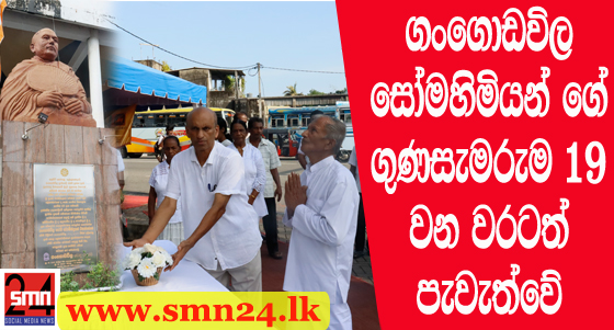 Post Views: 431 අපවත්වී වදාළ පූජ්යපාද ගංගොඩවිල සෝම හිමිපාණන්ගේ 19 වැනි ගුණ සමරු පිංකම අද (26) උන්වහන්සේ උපන් ගම වන ගංගොඩවිල දෙල්කඳ හයිලෙවල් ප්ලාසා ඉදිරිපිටදී ඇති ගංගොඩවිල සෝම හිමිපාණන්ගේ පිළිරුව අභියස දී පැවැත්වුනි. ගංගොඩවිල සෝම හිමිපාණන් ආගමික හා සමාජීය මෙහෙය ගැන අතීත මතක ආවර්ජනය කරමින් අනුශාසනාව කල ශාස්ත්රවේදී පූජ්ය පල්ලේවෙල දේවරක්ඛිත හිමිපාණෝ, සෝමහිමියන් රටේ වැඩි ජනතාවකට ජිවිතාවබෝධය ලබාදෙනු සදහා ජාතික රූපවාහිනිය සමග සම්බන්ධව ධර්ම සාකච්ඡා, ආගමික වඩසටහන් හා තවත් දැනුවත් කිරීම් රැසක් සිදුකල යතිවරයෙකු බව සදහන් කලහ. ගංගොඩවිල බොදු පදනමේ සභාපති දේශමාන්ය ජයන්ත ජයමාන්න මහතා අදහස් දක්වමින්, සෝමහිමිගේ වටිනාකම් කියා නිමකල නොහැකි බවත් එම කරුණ නිසාම සෑම වසරකම මෙම ගුණානුස්මරණ වැඩසටහන අඛන්ඩව සිදුකරනු ලබන බවත් සදහන් කරන ලදී. මෙම අවස්ථාවට ගංගොඩවිල සෝම හිමිපාණන්ගේ සොයුරු පත්මසිරි වීරතුංග මහතා සහ ගංගොඩවිල බොදු පදනමේ සාමාජික සාමාජිකාවන් ඇතුළු පිරිසක් සහභාගී වූහ. ගංගොඩවිල බොදු පදනම විසින් සංවිධානය කළ මෙම පිංකමේදී සෝම හිමිපාණන්ට අමතරව අපවත්වී වදාළ අති පූජ්ය බලංගොඩ ආනන්ද මෛත්රී මහ නාහිමිපාණන්, අති පූජ්ය මඩිහේ පඤ්ඤාසීහ මහ නාහිමිපාණන්, අති පූජ්ය මහාචාර්ය බෙල්ලන්විල විමලරතන නාහිමිපාණන්,පූජ්ය මාදුළුවාවේ සෝභිත හිමිපාණන්, ඇතුළු තවත් විහාරාධිපති හිමිපාණන් වහන්සේලාගේ ඡායාරූප තබා උන්වහන්සේලා ද අනුස්මරණය කරනු ලැබූහ. Post navigation ශ්රී ලංකා බාල දක්ෂ ව්යාපාරයේ 110 වන සංවත්සරය සමරා විශේෂ වැඩසටහනක්. “සක්වල” වැඩසටහනින් සජිත්ගේ 53 වැනි බස් රථ පරිත්යාගය අතුරුගිරිය විද්යාලයට.