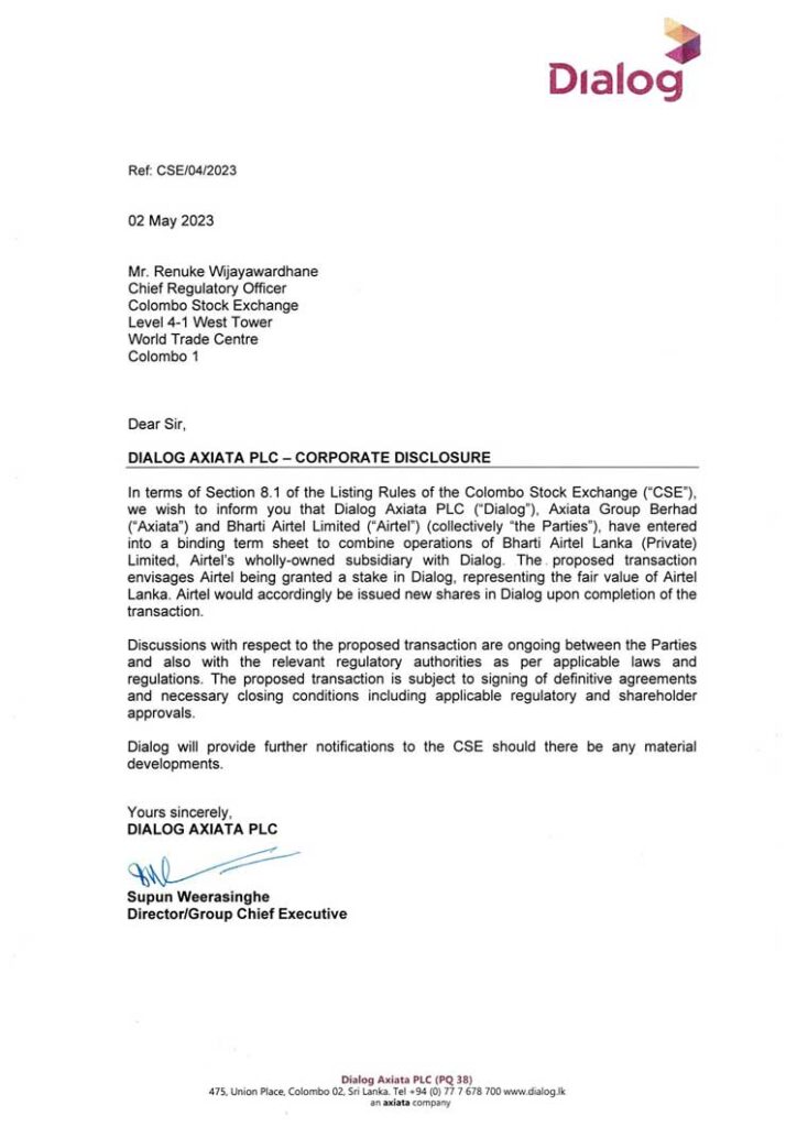 Post Views: 300 Bharti Airtel Lanka (පුද්) සමාගම ශ්රී ලංකාව තුළ සිය මෙහෙයුම් කටයුතු Dialog Axiata PLC සමඟින් ඒකාබද්ධ කිරීමට තීරණය කර තිබේ. මේ සම්බන්ධයෙන් කොළඹ කොටස් වෙළෙඳපොළ දැනුවත් කරමින් ඩයලොග් (Dialog Axiata PLC) හි අධ්යක්ෂ/ සමූහ ප්රධාන විධායක සුපුන් වීරසිංහ මහතා දන්වා ඇත්තේ, අදාළ නීති සහ රෙගුලාසිවලට අනුව පාර්ශව දෙක විසින් අදාළ නියාමන බලධාරීන් සමඟ සාකච්ඡා කරමින් සිටින බවයි.එසේම යෝජිත ගනුදෙනුව සඳහා නිශ්චිත ගිවිසුම් අත්සන් කිරීමට සහ අදාළ නියාමන සහ කොටස් හිමියන්ගේ අනුමැතිය ඇතුළුව අවශ්ය අවසන් කොන්දේසිවලට යටත් වනු ඇති බව කොළඹ කොටස් වෙළෙඳපොළ වෙත ඔහු වැඩිදුරටත් දැනුම් දී සිටී. Post navigation ගාලු මුවදොර ෂැංග්රිලා හරිත භූමියේ සහ ජනාධිපති කාර්යාල පරිශ්රයේ වෙසක් වැඩසටහන හෙට සිට. ජාතික පෝෂණ ප්රතිපත්තිය 2021-2030 එළිදැක්වෙයි.