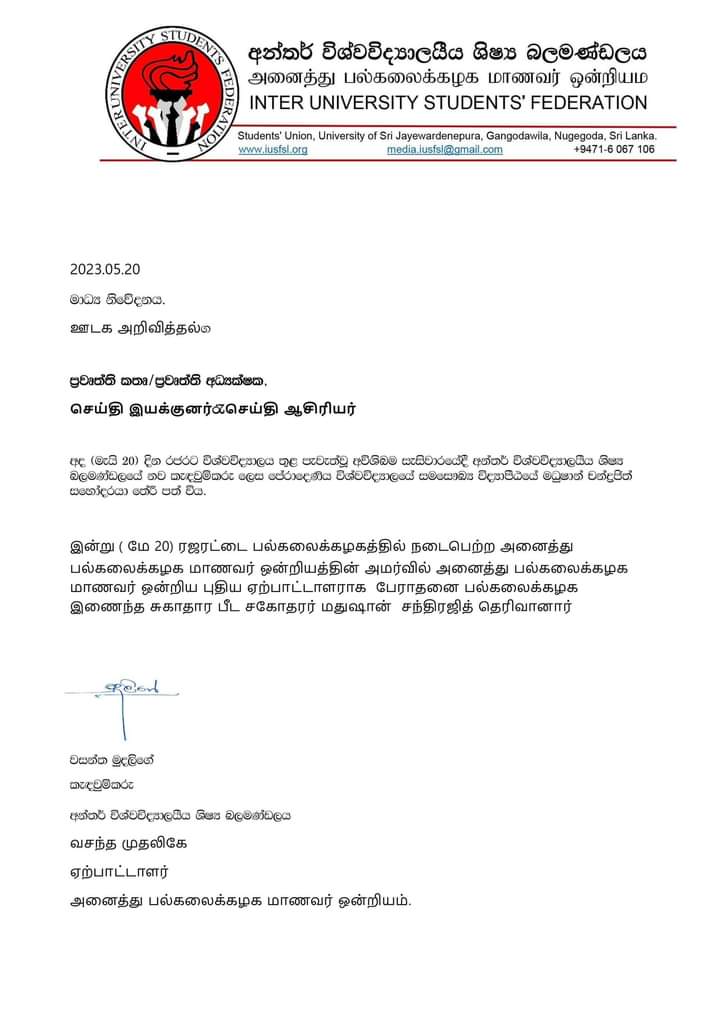 Post Views: 299 අද (20) රජරට විශ්ව විද්යාලයේදී අන්තර් විශ්ව විද්යාල ශිෂ්ය බළ මංඩලයේ සැසිවාරය පවත්වන ලද අතර එහිදී අ.වි.වි.ශි. බල මංඩලය සදහා නව කැදවුම්කරුවෙකු තෝරාපත්කර ගන්නා ලදී. ඒ අනුව, පේරාදෙණිය විශ්ව විද්යාලයේ සමසෞඛ්ය විද්යා පීඨයේ මධුෂාන් චන්ද්රජිත් අ.වි.වි.ශි. බල මංඩලයේ නව කැදවුම්කරු ලෙස තෝරාගෙන ඇත. මෙතෙක් අ.වි.වි.ශි. බල මංඩලයේ කැදවුම්කරු ලෙස කටයුතු කල වසන්ත මුදලිගේ ක්රියාකාරී ලෙස කැදවුම්කරු භූමිකාව ඉටුකරමින් මෙරට ජන සමාජයතුල ඉතා ඉහල මට්ටමේ ප්රසාදයක් හා ජනප්රියත්වයක් අත්කර ගත් අතර ඉදිරියේදී මෙරට දේශපාලන ප්රවාහය තුල සක්රීයව කටයුතු කරනු ඇති බවත් වාර්තාවේ. Post navigation වයස 16 පිරීමෙන් පසු හැදුනුම්පත ගත්තොත් දඩ කීවාට 2005 න් පසු ඉල්ලුම්කරුවන්ට දෙන්නේ කොළයක් පමණයි. ව්යාපාරික දිනේෂ් ෂාෆ්ටර් මහතාගේ දේහය යළි ගොඩගනී. පරීක්ෂණ සදහා කරාපිටියට යවයි.