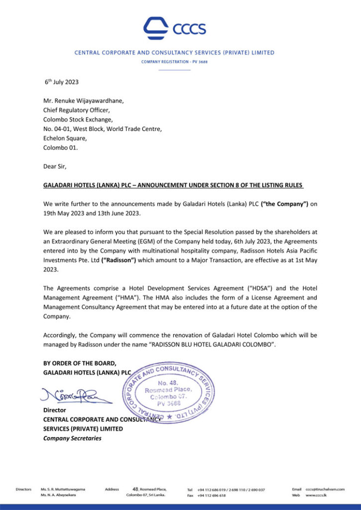 Post Views: 296 මෙරට ප්රමුඛතම හෝටල් සමාගමෙක් වන ගලදාරී හෝටලය, ලොව ප්රමුඛතම ආගන්තුක සත්කාරක සේවා සමාගමක් වන Radisson Hotels Asia Pacific Investments Pte. Ltd සමඟ ගිවිසුමකට එළඹ තිබේ. මෙම ගිවිසුම්ගත වීම සඳහා ඊයේ (06) පැවති අතිවිශේෂ මහා සභා රැස්වීමේ දී සිය කොටස්කරුවන්ගේ අනුමැතිය හිමිවූ බව ගලදාරී හෝටලය දැනුම් දී සිටී. මෙම ගිවිසුමට අනුව ගලදාරී හෝටලයේ අලුත්වැඩියා කිරීමකට ලක්වන අතර “RADISSON BLU HOTEL GALADARI COLOMBO” නාමය යටතේ එහි කළමනාකාරීත්වය Radisson සමාගම විසින් සිදුකරනු ඇත. මේ බව දැනුම් දෙමින් ගලදාරී හෝටේල්ස් (ලංකා) පීඑල්සී විසින් කොළඹ කොටස් වෙළෙඳපොළ වෙත නිකුත් කරන ලද නිවේදනය පහතින් දැක්වේ. Post navigation සිය මංගල ගමන අරඹමින් හම්බන්තොට වරායට සම්ප්රාප්ත වුණු Cordelia Cruises නෞකාව Hayleys Aventura සන්නාම සමුළුව.