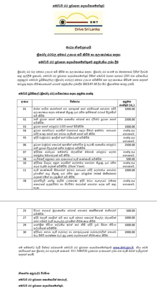Post Views: 297 මෙරට ලක්ෂ 10 කට අධික ත්රී රෝද රථ හිමියන්ගේ දීර්ඝ කාලයක පටන් තිබූ ගැටළුවකට විසදුමක් මෝටර් රථ ප්රවාහන දෙපාර්තමේන්තුවෙන් ලබා දී ඇත.ඒ, මෙතෙක් දිනක් නිසි අවසරයකින් තොරව සවිකර තිබූ ත්රී රෝද රථ අලංකරණ කොටස් සදහා අවශ්ය අනුමැතිය ලබාගෙන සවිකරගැනීමට ඉඩ ලබාදෙමිනි.ඒ අනුව, යම් සීමාවකට යටත්ව මෙම උපාංග සවිකිරීමට අවසර ලැබෙන අතර, අදාල විස්තර පහතින් සදහන් වේ. Post navigation නියමිත කාල සටහනකට දුම්රිය ධාවනය කරන්න පහසුකම් නැහැ. “පඩු කරද” ශාකය ඉවත් කිරීම ගැන ඇමතිගේ ප්රකාශය ට පරිසර යුක්ති කේන්ද්රය පිළිතුරු දෙයි.