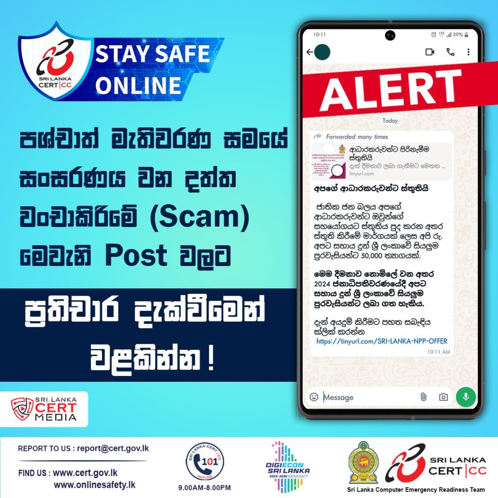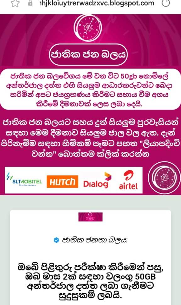 Post Views: 300 ශ්රී ලංකා තරුණ සවිබල ගැන්වීමේ අරමුදලේ වැඩසටහන 2024 යන තේමාවෙන් යුක්තව රැකියා විරහිත පුරවැසියන්ට ගෙවීමට සහ ශ්රී ලංකාවේ අර්බුධයෙන් පීඩාවට පත් පුරවැසියන්ට වන්දි ගෙවීම සදහා ශ්රී ලංකා රජය රුපියල් 50,000 ප්රදාන මුදලක් අනුමත කර ඇති බව සදහන් කරමින් ඒ සදහා අයදුම් කරන ලෙසට දන්වා පණිවිඩයක් සමාජ මාධ්යය හරහා සීඝ්රයෙන් පැතිරෙමින් පවතී. https://tinyurl.com/SRI-LANKA-YT-EMPOWERMWNT-2024 මෙම පුවතේ සත්යතාව සම්බන්ධයෙන් කරුණු පරීක්ෂාවක් සිදුකරන ලද අතර එහිදී මුලින්ම විමර්ශනයට ලක්කෙරුනේ මෙම පුවත රාජ්ය ලාංඡනය සහිතව රජයේ වැඩසටහනක් ලෙසට කර තිබූ පලකිරීමක් නිසා එහි වෙබ් අඩවි නාමය (Domain Name) රජයේ වෙබ් නාමයක් ද (gov.lk) යන්නයි. මෙහිදී පෙනී ගියේ එය ශ්රී ලංකා රජයේ වෙබ් අඩවි නාමයන් සදහා බාවිතා කරන gov.lk නාම කරනය රහිත වෙබ් අඩවියක් බවයි.අනතුරුව මේ සම්බන්ධයෙන් රජයේ යම් සම්බන්ධයක් තිබේද යන කරුණ සම්බන්ධයෙන් අග්රාමාත්ය මාධ්ය ලේකම්වරයාගෙන් විමසීමේදී එම පණිවිඩය සදහා රජයේ කිසිදු සම්බන්ධයක් නොමැති බව සදහන් කරන ලදී. මේ සම්බන්ධයෙන් ශ්රී ලංකා පරිගණක හදිසි ප්රතිචාර ඒකකය (Sri Lanka Computer Emergency Readiness Team (SLCERT) වෙතින් විමසීමක් කල අතර එහි තොරතුරු ආරක්ෂක ඉංජිනේරු චාරුක දමුණුපොල විසින් සදහන් කරන ලද්දේ මෙය ව්යාජ තොරතුරක් බවත් මේ ආකාරයේ ව්යාජ තොරතුරු විවිධ ආකාරයන්ට සමාජ මාධ්යය හරහා පතුරුවමින් නොයෙකුත් වංචා කිරීමට විවිධ කණ්ඩායම් ක්රියාකරන බැවින් එවැනි වංචනිකයන්ට අසුනොවන ලෙසත් ය. මෙවැනි ව්යාජ පලකිරීම් මගින් ඇතිවන තත්වය කුමක්ද යන්න පිළිබදව විමසීමක් කිරීමේදී හෙළිවූයේ මෙවැනි දේ කරුණු කිහිපයක් මත සමාජ මාධ්යයන් තුල පැතිරීමට ඉඩ තිබෙන බවකි.1 සහන හෝ දීමනාවක් ලබාදෙන බවට ජනතාව අතර මතයක් ඇතිකර රජය අපහසුතාවයට පත්කිරීම සදහා.2 පුද්ගල තොරතුරු ලබාගෙන එම තොරතුරු බාවිතා කරමින් ඒ හරහා වෙනත් වංචනික කටයුතු සිදු කිරීමට.3 කිසිදු අරමුණකින් තොරවම සමාජය තුල යම් කැළඹිලිකාරී ස්වරූපයක් ඇතිකර තෘප්තියට පත්වීමට.මේ නිසාවෙන් කිසිදු අවස්ථාවක තමන්ගේ දුරකථනයට හෝ පරිගණකයට හෝ ලැබෙන මෙවැනි අසාමාන්ය ආකාරයේ වාසි හෝ දීමනා සම්බන්ධ යොමුවන් වෙත යාමට හෝ ඒවාට ජනතාවගේ පුද්ගලික තොරතුරු ලබාදීමෙන් වලකින ලෙසත් ශ්රී ලංකා පරිගණක හදිසි ප්රතිචාර ඒකකය මහජනතාවට දැනුවත් කරසිටී. මේ පිළිබදව තව දුරටත් කල පරීක්ෂාවන් හී ප්රතිපලයක් ලෙස එකී ආධාර ලබාදීමේ වැඩසටහනට අදාල අන්තර්ජාල පලකිරීම වෙනසකට ලක්කර එය පසුගිය මැතිවරණයේ දී ජාතික ජනබලවේගයට ඡන්දය දුන් පිරිසට අන්තර්ජාල පහසුකම් සදහා ඬේටා නොමිලයේ ලබා දීමක් ලෙසට වෙනස් කර ඇත. https://vfdsdthhjkloiuytrerwadzxvc.blogspot.com/?m=1#1729170255494 මේ පිළිබදව අප විසින් කල විමසීම නිසා අදාල පුවත ගැන දැනුවත් වූ ශ්රී ලංකා පරිගණක හදිසි ප්රතිචාර ඒකකය (Sri Lanka Computer Emergency Readiness Team (SLCERT) වෙතින් ජනතාව දැනුවත් කිරීමට පහත ප