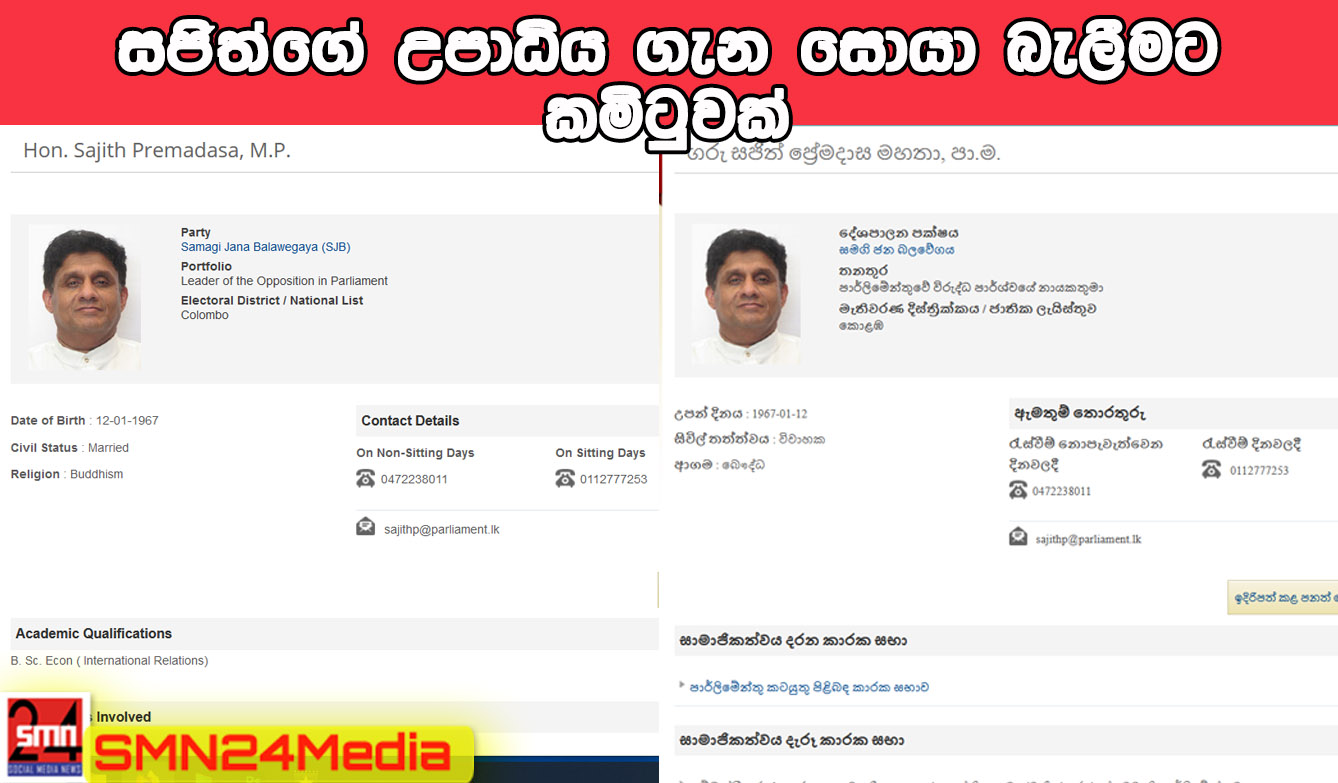 Post Views: 167 කතානායක අශෝක රන්වල මහතා සිය ආචාර්ය පට්ටම නිසාවෙන් ධූරයෙන් ඉල්ලා අස්වීමත් සමගම මෙවර පාර්ලිමේන්තුවේ සිටින පක්ෂ විපක්ෂ මංත්රීවරුන් කිහිපදෙනෙකුගේම තනතුරු නාම හා උපාධි පට්ටම් ගැන සමාජයේ කතාබහක් ඇතිව තිබේ. ඒ අනුව තවත් බොහෝ පිරිසක් සදහන් කරනුයේ විපක්ෂ නායක සජිත් ප්රේමදාස මහතාගේ අධ්යාපන සුදුසුකම් පිළිබදවත් පරික්ෂාකර බැලිය යුතු බවයි. විශේෂයෙන්ම සජිත් ප්රේමදාස මහතා සිය අධ්යාපන සුදුසුකම් ලෙස පාර්ලිමේන්තු වෙබ් අඩවියේ ඉංග්රීසී භාෂාවෙන් සිය සුදුසුකම් ලෙස B. Sc. Econ ( International Relations) ලෙස සදහන්ව තිබුනත් එම වෙබ් අඩවියේම සිංහල භාෂාවෙන් විස්තර සදහන් වෙබ් පිටුවේ කිසිදු අධ්යාපනික සුදුසුකමක් සදහන්ව නොතිබීමත් පිලිගත නොහැකි තත්වයක් බව පෙන්වාදෙන නීතී විශාරදයින් සදහන් කරනුයේ විපක්ෂ නායක වරයාගේ අධ්යාපන සුදුසුකම් ද පරීක්ෂා කලයුතු බවයි. ඒ සදහා ස්වාධීන කමිටුවක් පත්කර සියළු මංත්රීවරුන්ගේ සුදුසුකම් පරීක්ෂා කිරීමට කටයුතු කලයුතු බවත් ජනතාව පවසයි. එමෙන්ම ඉදිරියේදී සජිත් ප්රේමදාස මහතාට එරෙහිව පාර්ලිමේන්තුවට විශ්වාස බංගයක් ගෙන ඒමේ සූදානමක් පවතින බවත් වාර්තාවේ. Post navigation කතානායක අශෝක රන්වල සිය ධූරයෙන් ඉල්ලා අස්වෙයි. දිනෙන් දින රට තුල රිය අනතුරු ඉහලට – පොලිස් වාර්තා හෙළි කරයි.