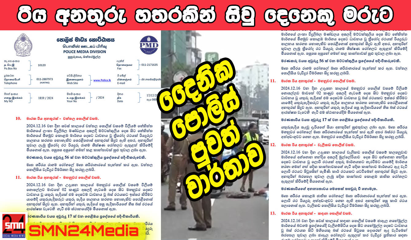 Post Views: 160 පසුගිය දින කිහිපය තුල මෙරට දෛනිකව සිදුවන රථ වාහන අනතුරු වල ඉහල යාමක් සිදුව ඇති බව පොලිස් මාධ්ය කොට්ඨාශයේ වාර්තා පෙන්නුම් කරයි. පොදු ප්රවාහන සේවා විධිමත් නොවීම හා ප්රමාණවත් නොවීම තුල ජනතාව කෙසේ හෝ තමන්ගේ පුද්ගලික ප්රවාහන මාධ්යයකින් සිය අවශ්යතා සපුරා ගැනීමට පෙළඹී ඇත. මේ නිසා මාර්ගවල ඇතිව තිබෙන අධික තදබදය රියදුරන්ගේ ඉවසීම නැතිකර මාර්ග නීතී උල්ලංඝනය කිරීමට ඔවුන් නිතැතින්ම යොමුවීම මේ තත්වයට ප්රධානතම හේතුවක් බව පෙනේ. ගෙවී ගිය දිනය තුල පමණක් රට තුල සිදුවූ රිය අනතුරු විශාල ප්රමාණයක් අතුරින් මාරක රිය අනතුරු හතරක් නිසා පුද්ගල ජීවිත හතරක් අහිමිවී තවත් තිදෙනකු තුවාල ලබා ඇත. එම සිදුවීම් වලින් වාර්තා වූ ශෝචනීයම සිදුවීම වාර්තා වූයේ මහනුවර ප්රදේශයෙන් වන අතර එම සිදුවීමේදී ජීවිතක්ෂ්යට පත්ව ඇත්තේ පියා සමඟ යතුරුපැදියේ ගිය වයස අවුරුදු 17 ක පාසල් සිසුවියකි. මහනුවර පොලිස් වසමේ විලියම් ගොපල්ලව මාවතේ කි.මී 02 කණුව අසලදී ඊයේ (16) උදෑසන සිදුවූ එම අනතුරෙන් ගැටඹේ දෙස සිට මහනුවර දෙසට ධාවනය වු යතුරු පැදියක් එම දෙසටම ධාවනය වු බස් රථයක් පසුකර යාමට උත්සාහා කිරීමේ දි යතුරුපැදිය පාලනය කරගැනීමට නොහැකිව පෙරලී බස් රථයේ ගැටි ඇත. එම අනතුරින් යතුරු පැදියේ පිටුපස ගමන්ගත් පාසල් සිසුවියගේ හිස බස් රථයේ ආරක්ෂක වැටෙහි ගැටී ඇය එම ස්ථානයේදීම මියගොස් තිබේ.මෙවැනි ශෝචනීය සිදුවීම් දිනෙන් දින ඉහල යන තත්වයක් තුල රථවාහන පොලීසිය මහජනතාවගෙන් ඉල්ලා සිටිනුයේ මාර්ගයට කුමන හෝ රථයක් ඇතුළු කරන විටදී මාර්ග නීතී වලට අනුකූලව සිහි කල්පනාවෙන් ගමන් ගන්නා ලෙසයි. අනතුරක් සිදුවූ පසුව එහි සමස්ථ අලාභය කිසි ලෙසකින්වත් පූරණය කල නොහැකිබව නිරතුරුවම සිහි තබාගෙන කටයුතු කරන්නේ නම් රිය අනතුරු අවම කරගත හැකි බවත් පොලීසිය සදහන් කරයි. Post navigation සජිත් ප්රේමදාසටත් විශ්වාසභංගයක් ගෙන ඒමේ සැලසුමක්. ඇමතිවරයෙකුගේ මංත්රීකම බලරහිත කරන ලෙස ඉල්ලා අභියාචනාධිකරණයට පෙත්සමක්.
