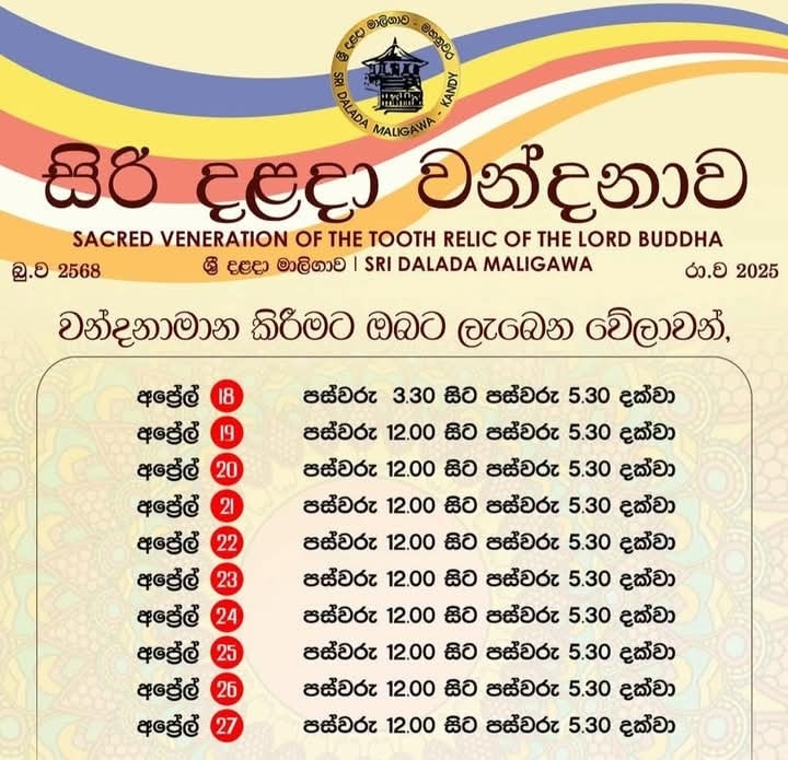 Post Views: 127 හෙට (18) සිට ආරම්භ කිරීමට නියමිත දළදා දැක්ම වෙනුවෙන් මහජනතාව ඊයේ සිටම පෝලිම්වල එක්රොක් වී සිටිනාකාරය මේ වන විටදී මහනුවර දක්නට ලැබේ.සැදැහැ සිතින් දළදා වඳපුදා ගැනීම පිණිස මෙසේ පැමිණි ගැහැණු පිරිමි ළමා ලපටි බාළ මහළු බැතිමත්තුහු දළදා වන්දනාව සඳහා ජනතාව පෙළ ගැසීමට සකසා ඇති පෝලිම්වල ඉටි රෙදි බිම එළාගෙන වැතිර සිටින ආකාරය දක්නට ලැබීම මෙරට ජනතාවගේ ආගමික ශ්රද්ධාව මනාව පිළිඹිබු කරන්නකි.මේ ආකාරයෙන් දළදා වන්දනාව ආරම්භ කිරීමට නියමිත දිනට පෙර සිටම ජනතාව මෙසේ එක් රොක් වීම නිසා මහනුවර මහනගර සභාවට ත් අමතර ගැටලුවක් උද්ගත වී තිබේ. ඒ මෙම පිරිසට අවශ්ය මූලික සනීපාරක්ෂක පහසුකම් සැලසුම් කල දිනට පෙර සිටම ලබාදීමට පියවර ගත යුතු නිසාය. කෙසේ නමුත් ඒ සඳහා අවශ්යය සියලූ විකල්ප ක්රියාමාර්ග ගෙන ඇති බව මහනුවර මහ නගර සභාව සඳහන් කර සිටී.එමෙන්ම ජනතාවට අවශ්යය සියලුම සෞඛ්ය පහසුකම් සඳහා අවශ්යය විධිවිධාන සලසා ඇති බව මහනුවර මහ නගර සභාවේ ප්රධාන නාගරික වෛද්ය නිලධාරී පසන් ජයසිංහ මහතා සඳහන් කර සිටින ලදී .විශේෂයෙන්ම දළදා වන්දනාව ආරම්භ කෙරෙන 18 වෙනිදා සිට පුරා දින දහයක් මහනුවර නගරය පුරා දන්සැල් 228 ක් ක්රියාත්මක බවත් එයට අමතරව නගර සභාවේ ලියාපදිංචිය ලබාගෙන ඇති ජංගම වෙළඳුන් විසි අටක් ආහාරපාන අලෙවි කිරීම සඳහා අවසර ලබාගෙන ඇති බවත් නාගරික වෛද්යවරයා සඳහන් කරන ලදී. හෙට (18) සිට සැදැහැවතුන්ට ශ්රී දළදාව වන්දනා කිරීමට අවස්ථාව උදාවන්නේ පහත පරිදිය, අප්රේල් මස 18 වන දින ප.ව. 3.00 සිට ප.ව. 5.30 දක්වාත්,අප්රේල් මස 19 වන දින සිට 27 වන දින දක්වා දිනපතා මධ්යහන 12.00 සිට ප.ව. 5.30 දක්වාත් ය. Post navigation වෛද්ය රසායනාගාර කාර්මික විද්යාඥ හා භෞත චිකිත්සක යන තනතුරුවලට බඳවා ගැනීමේ තරඟ විභාගයේ දින නිකුත් කෙරේ. Suspicious parcel : Bomb disposal squad called to Russian Embassy in Colombo