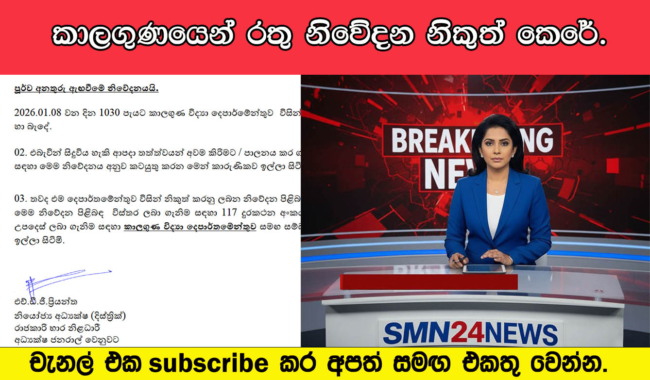 Post Views: 61 ශ්රී ලංකාවට ගිනිකොණ දෙසින් බෙංගාල බොක්ක මුහුදු ප්රදේශයේ ඇතිවූ පීඩන අවපාතය මේ වන විට ගැඹුරු පීඩන අවපාතයක් දක්වා තවදුරටත් වර්ධනය වීමක් දක්නට ඇති බව කාලගුණ විද්යා දෙපාර්තමේන්තුව පවසයි. එම නිසා නැවත දැනුම් දෙන තුරු දිවයින වටා වන මුහුදු ප්රදේශවල ධීවර සහ නාවික කටයුතුවලින් වැළකී සිටින ලෙසත් දෙපාර්තමේන්තුවේ අනාවැකි සහ නිවේදන පිළිබඳව ධීවර, නාවික ප්රජාව සහ සියලු මහජනතාව අවධානයෙන් පසුවන ලෙසත් කාලගුණ විද්යා දෙපාර්තමේන්තුව ඉල්ලා සිටී. සුළඟේ වේගය පැයට කිලෝමීටර් 50 – 60 අතර පමණ විය හැකි බවත් සදහන් කරන කාලගුණ විද්යා දෙපාර්තමේන්තුව, උතුරු, උතුරු මැද, නැගෙනහිර යන පළාත් තුනකට අනිද්දා (10) දක්වා වලංගු වන පරිදි තද සුළං පිළිබඳව අනතුරු ඇඟවීමේ රතු නිවේදනයක් ද බස්නාහිර, වයඹ, මධ්යම පළාත්වලට අද (8) සහ හෙට (9) දිනවලට වලංගු වන පරිදි රතු නිවේදනයක් ද නිකුත් කර ඇත. පළාත් කිහිපයකටම මිලිමීටර් 100 ට වැඩි තද වැසි ඇති වීමේ තත්වයක් තිබෙන බවත් නාය යාම් පිලිබඳව අවධානයෙන් සිටින ලෙසත් කාලගුණ විද්යා දෙපාර්තමේන්තුව දන්වා සිටී. Post navigation මහ රෑ නවගමුවෙන් පත්තුවූ වෙඩිල්ල. அறிமுகப்படுத்தப்படவுள்ள புதிய காப்பீட்டு அட்டைக்கு இணங்க மேல் மாகாண போக்குவரத்து பொலிஸ் அதிகாரிகளுக்கு 500 டேப் கணினிகள்.
