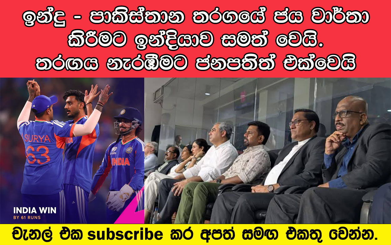 Post Views: 145 පන්දුවාර 20 – 20 ලෝක කුසලාන ක්රිකට් තරඟාවලියේ වඩාත් කතාබහට ලක්වූ තරගය වන ඉංදියාව සහ පාකිස්තානය අතර තරඟය අද පැවැත්වුණේ කොළඹ ආර් ප්රේමදාස ක්රීඩාංගණයේදී. අද පස්වරු 7.00 ට ආරම්භවූ මෙම තරඟය නැරඹීම සඳහා ජනාධිපති අනුර කුමාර දිසානායක මහතා සහ ජාත්යන්තර ක්රිකට් කවුන්සිලයේ සභාපති ජේ ෂා මහතා ද ක්රීඩාංගණයට පැමිණ සිටියා. මෙම තරගය පිළිබද දෙස් විදෙස් සියලු දෙනාගේ අවධානය වැඩි වශයෙන් යොමු වුණේ පකිස්ථාන කණ්ඩායම තරගය වර්ජනය කරන බවට කල ප්රකාශයත් සමගයි. මෙම ගැටලුකාරීත්වය දින කිහිපයක් පැවැති අතර අනතුරුව තරගය සදහා පකිස්ථාන කණ්ඩායම සහභාගී වන බව නිළ වශයෙන් දැනුම් දීමත් සමඟ තරඟය නැරඹීමට අති විශාල ප්රේක්ෂක ඉල්ලුමක් ඇති විය. කොළඹ ආර් ප්රේමදාස ක්රීඩාංගණයේ ආසන ධාරිතාවය 35,000 කට සීමා වුවත් ලක්ෂ ගණනාවක් ප්රේක්ෂකයින් ප්රවේශපත් මිළදී ගැනීමට පොදි කමින් කටයුතු කල බව ශ්රී ලංකා ක්රිකට් ආයතනය සඳහන් කරන ලදී. දැඩි ආරක්ෂක විධිවිධාන සහිතව පැවති මෙම තරගය ආරම්භයට පෙර තරගාවලියේ සන්නාම තානාපති ඉන්දීය ක්රිකට් කීඩක රෝහිත් ශර්මා විසින් ශූරතා කුසලානය ක්රීඩාංගණයට රැගෙන එනු ලැබුවා. අනතුරුව, තරගයේ කාසියේ වාසිය දිනා ගත් පකිස්ථාන කණ්ඩායම පළමුවෙන් පන්දුවට පහර දීමේ අවස්ථාව ඉන්දියාවට ලබා දුන්නා. ඒ අනුව ඉන්දීය ඉනිම ආරම්භ කලේ ඉෂාන් කිෂන් සහ අභිශේක් ෂර්මා. ඔවුන් දෙදෙනාගේ ආරම්භක කඩුල්ලේ සම්බන්ධතාව එක් ලකුණකට සීමා කරමින් අභිශේක් ෂර්මා ලකුණු නොලබා දැවී ගියා. ඉෂාන් කිෂන් පන්දු 40 කදී ලකුණු 77 ක් රැස් කලේ 4 පහර 10 ක් සහ 6 පහර 3 ක් සමග.තිලක් වර්මා ලකුණු 25 කට දැවී ගිය අතර නායක සූර්ය කුමාර් යාදේව ලකුණු 32 යි.ශිවාම් ඩුබේ ලකුණු 27 ක් රැස් කළා. ඒ අනුව ඉන්දීය කණ්ඩායම පන්දු වාර 20 ඇතුළත කඩුලු 7 ක් දැවි ලකුණු 175 ක් රැස් කළා. අනතුරුව තරගය ජය ගැනීම සදහා ලකුණු 176 ක ඉලක්කයක් සමග පකිස්ථාන ඉනිම ආරම්භ කලේ සහිබ්සාඩා ෆර්හාන් සහ සයිම් අයුබ්.පළමු කඩුල්ල ලෙස ෆර්හාන් ලකුණු නොලඹා දැවී ගිය අතර අයුබ් ලකුණු 6 යි. පකිස්ථාන කණ්ඩායමේ පළමු කඩුලු 4 ලකුණු 34 කට දැවී ගිය අතර ඉනිමේ වැඩිම ලකුණු ලාභියා වූ උස්මාන් ඛාන් ලකුණු 44 යි.පකිස්ථාන කණ්ඩායම පන්දු වාර 18 කදී සියලු ක්රීඩකයන් දැවී ලකුණු 114 ක් රැස් කළා. ඒ අනුව ඉන්දීය කණ්ඩායම ලකුණු 61 කින් තරඟයේ ජය වාර්තා කලා. Post navigation All tickets are sold out. police advice to public not to come RPC ground area without ticket. වාර්තා අළුත් කරමින් T-20 ලෝක කුසලානයේ සුපිරි 8 වටයට තේරුන ශ්රී ලංකාව.