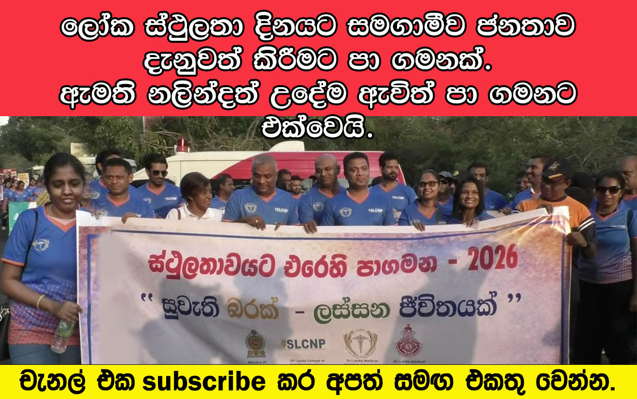 Post Views: 132 ලෝක ස්ථුලතා දිනයට සමගාමීව, සමාජය තුළ ව්යාප්ත වෙමින් පවතින ස්ථුලතාවය (Obesity) පිළිබඳ ජනතාව දැනුවත් කිරීමේ අරමුණින් සංවිධානය කළ විශේෂ පාගමනක් සහ රැළියක් අද (07) පෙරවරුවේ කොළඹදී පැවැත්වුණි. සෞඛ්ය හා ජනමාධ්ය අමාත්යාංශය, ශ්රී ලංකා පෝෂණ විශේෂඥ වෛද්යවරුන්ගේ විද්යායතනය, ශ්රී ලංකා පෝෂණ වෛද්ය සංගමය සහ ශ්රී ලංකා වෛද්ය සංගමය එක්ව සංවිධානය කළ මෙම පාගමන විහාරමහාදේවි උද්යානයෙන් ආරම්භ විය. මේ සඳහා සෞඛ්ය හා ජනමාධ්ය අමාත්ය වෛද්ය නලින්ද ජයතිස්ස මහතා ඇතුළු සෞඛ්ය වෘත්තිකයන් රැසක් එක්ව සිටියහ. ස්ථුලතාවය යනු කුමක්ද?ශරීරයේ අධික ලෙස මේදය තැන්පත් වීම ස්ථූලතාවය ලෙස හඳුන්වයි. ලෝක වැඩිහිටි ජනගහනයෙන් 33%කට ආසන්න ප්රමාණයක් අධිබර හෝ තරබාරු තත්ත්වයෙන් පෙළෙන බව සංඛ්යා දත්ත තහවුරු කරයි. අප ආහාර මඟින් ලබා ගන්නා ශක්තිය (Calories) මුළුමනින්ම අපගේ දෛනික ක්රියාකාරකම් සඳහා වැය නොවන විට, එම අමතර ශක්තිය මේදය ලෙස ශරීරයේ තැන්පත් වීමෙන් ස්ථූලතාවය ඇතිවේ. මෙම තරබාරුකම හඳුනා ගැනීමට ක්රම කිහිපයක් තිබෙන අතර ශරීර ස්කන්ධ දර්ශකය (BMI) ඉන් ප්රධානයි. එමගින් කරනුයේ අපගේ උසට සරිලන බර ඇති දැයි දැන ගැනීම සඳහා ශරීර ස්කන්ධ දර්ශකය යොදා ගැනීමයි. ශරීරයේ බර කිලෝග්රෑම් වලින් සහ උස මීටර් වලින් ලබා ගෙන ශරීර බර උසින් බෙදීමෙන් ලැබෙන අගය ශරීර ස්කන්ධ දර්ශකය ලෙස ගනු ලබයි එහිදී, ශරීර ස්කන්ධ දර්ශකය (BMI) 27.5 ට වැඩි නම් ස්ථූලතාවය ලෙසද, 23 ට වැඩි නම් අධිබර ලෙසද සැලකේ. ස්ථුලතාවය මනින තවත් ක්රමයක් වන්නේ ඉණේ වට ප්රමාණය මැණ බැලීමයි. ඉණේ වට ප්රමාණය මැනීම මඟින් අධික ලෙස උදරයේ තෙල් තැන්පත් වීම හඳුනා ගත හැකිය. නියමිත ප්රමාණයට වඩා ඉණ වට ප්රමාණය වැඩි වීම, එනම් අසාමාන්ය ලෙස උදරයේ තෙල් තැන්පත් වීම මඟින් දියවැඩියාව, හෘදයබාධ වැනි තත්ත්වයන් වලට ගොදුරු වීමේ අවදානම වැඩි කරයි. ඒ අනුව, ඉණේ වට ප්රමාණය පිරිමි පුද්ගලයන් සඳහා 90 cm ට වඩා අඩුවෙන්ද, කාන්තාවන් සඳහා 80 cm ට වඩා අඩුවෙන්ද පවත්වා ගැනීම සෞඛ්ය සම්පන්න ජීවිතයක් සඳහා වැදගත් වෙයි. මෙහිදී ඉණේ වට ප්රමාණය මැනීම කල යුත්තේ මිනුම් පටියක් උදරය වටා පෙකණිය මට්ටමින් රඳවා, හුස්ම පිට කිරීමෙන් පසු දැක්වෙන අගය ලබා ගැනීමෙනි. අවදානම සහ හේතු සාධකස්ථූලතාවය ඇති වීමට හේතු ගණනාවක් බලපාන අතර ප්රධාන වශයෙන්ම සෞඛ්ය සම්පන්න නොවන ආහාර රටාවක් තිබීම බලපාන අතර ව්යායාම නොකිරීම, සමහර ඖෂධ වල අතුරු ආබාධ, ජාන මගින් දෙමව්පියන්ගෙන් දරුවන්ට ප්රවේණිගත වීම සහ මානසික ආතතිය යන කරුනුත් බලපානු ලබයි. තරබාරුකම සෞඛ්යට බලපානු ලබන ආකාරය ගැන දැනුවත් වීමත් වැදගත් වන අතර ස්ථූලතාවය වෙනත් බොහෝ රෝගී තත්ත්වයන්ට ගොදුරු වීමේ අවදානමද වැඩි කරයි. මේ නිසාවෙන් ස්ථූලතාවයෙන් අත්මිදීම සෞඛ්ය සම්පන්න දිවියකට අවශ්යම කරුනක් නිසා උසට සරිලන නියමිත බර දක්වා ශරීරයේ බර අඩ