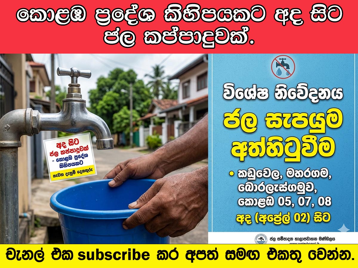 Post Views: 155 කොළඹ දිස්ත්රික්කයේ ප්රදේශ කිහිපයකට අද (02) රාත්රී 8.00 සිට ජල කප්පාදුවක් ක්රියාත්මක වනවා. ඒ අනුව, අදාළ ප්රදේශ සඳහා ජල සම්පාදන මණ්ඩලය විසින් SMS පණිවිඩයක් මගින් ඒ පිළිබඳව කල්තියා දැනුම් දෙනු ලැබෙනවා. එසේම මෙම ජල කප්පාදුව පාදුක්ක ප්රදේශයෙන් ආරම්භ වන අතර, එය පැය 24 පුරා ක්රියාත්මක වනු ඇති. කලටුවාව සහ ලාබුගම ජලාශවලට එල්ල වන පීඩනය අවම කිරීම මෙම සීමාවන් පැනවීමේ අරමුණයි. Post navigation මහින්ද අභවප්රාප්ත වෙයි. කොළඹට ජලය සපයන ජලාශ හිඳිලා ජල සැපයුම කප්පාදු කරන්නේ මෙහෙමයි.