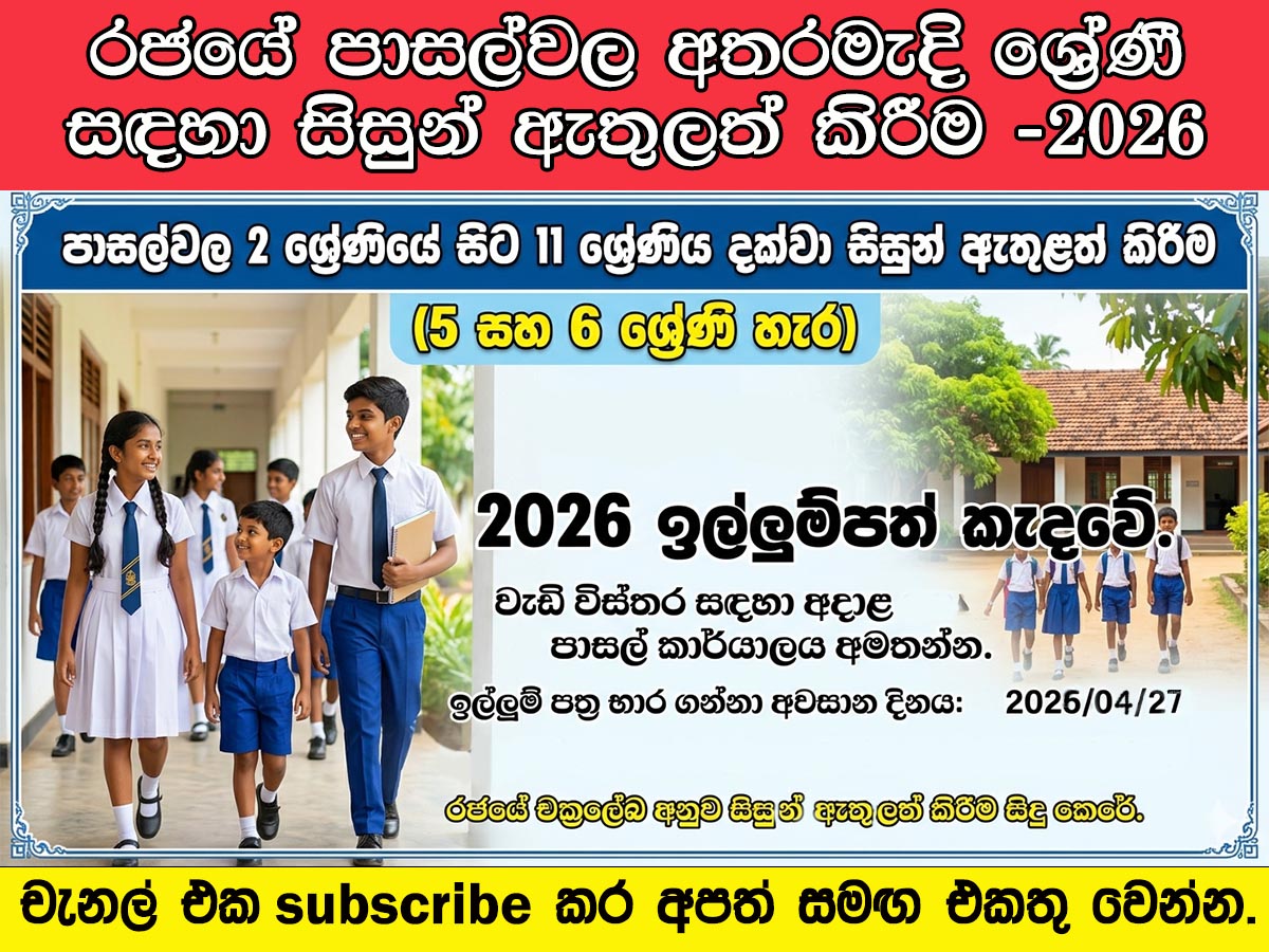 Post Views: 163 2026 වර්ෂයේ සිට පාසල්වල 2 ශ්රේණියේ සිට 11 ශ්රේණිය දක්වා සිසුන් ඇතුළත් කිරීම (5 සහ 6 ශ්රේණි හැර) සම්බන්ධයෙන් අධ්යාපන, උසස් අධ්යාපන සහ වෘත්තීය අධ්යාපන අමාත්යාංශය විසින් 2026.03.31 දිනැතිව 09/2026 චක්රලේඛය නිකුත් කර ඇත. එම චක්රලේඛය ප්රකාරව 2026 අධ්යයන වර්ෂයේ ජාතික පාසල්වල අතරමැදි ශ්රේණිවල පවතින පුරප්පාඩු සඳහා සිසුන් ඇතුළත් කර ගැනීම සිදු කරනු ලබයි. ඒ අනුව, 2026.01.31 දිනට ජාතික පාසල්වල අතරමැදි ශ්රේණිවල පවත්නා පුරප්පාඩු මේ සමග අධ්යාපන, උසස් අධ්යාපන සහ වෘත්තීය අධ්යාපන අමාත්යාංශ නිල වෙබ් අඩවියේ ප්රසිද්ධ කර ඇත. එම පුරප්පාඩු සඳහා අයදුම් කිරීමට අපේක්ෂා කරන සියලු ම අයදුම්කරුවන් 09/2026 චක්රලේඛයෙහි සඳහන් අයදුම්පත්රය සම්පූර්ණ කර 2026.04.27 දිනට පෙර සියලු අතිරේක ලේඛන ද සමග අදාළ පාසල්වල විදුහල්පතිවරුන් වෙත ලියාපදිංචි තැපෑල මඟින් යොමු කළ යුතුය. Vacancy-31.01.2026-Colombo-DistrictDownload Vacancy-31.01.2026-Gampaha-DistrictDownload Vacancy-31.01.2026-Kalutara-DistrictDownload Post navigation සාමාන්ය පෙළ විභාගය අවසන්වීමෙන් පසු කලබල කලොත් වැඩ වරදියි. පොලීසිය කියයි. Prevention of Violent Incidents Involving School Students After the OL Examination.